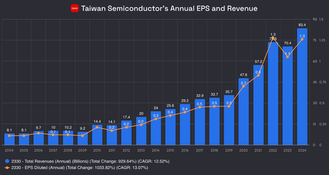 Hihetetlen teljesítményt nyújtott a $TSM. A bevételek 2024-ben elérik a 83 milliárd dollárt, szemben a 2004-es 8 milliárd dollárral. De vajon fenntartható-e a jelenlegi ütem? A következő pár évben szerintem egyértelmű, de mi lesz ezután? Tartja valaki a TSM-et hosszú távon?