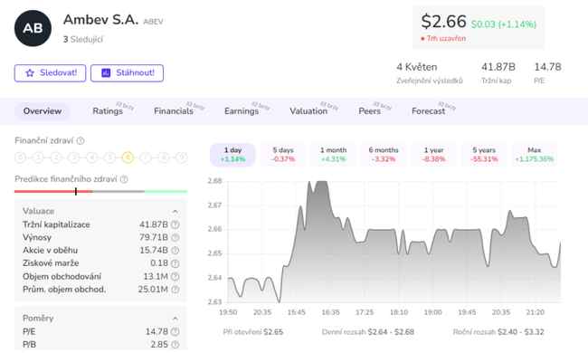 Az Ambev piaci kapitalizációja 40,97 milliárd dollár, a P/E 15,29 és a forward P/E 17,53, ami azt jelzi, hogy a piac növekedést vár a vállalattól. A PEG (ár/nyereség/növekedés) arány 1,63, ami arra utal, hogy a részvény a nyereség növekedése miatt kissé túlértékelt lehet.