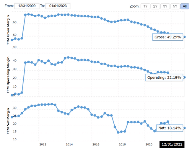 A P/B és P/S arányok 2,71 és 2,75, ami kissé az iparági átlag felett van, de nem borzalmas. A ROA (eszközarányos megtérülés) 10,6%, a ROE (saját tőkearányos megtérülés) pedig 17,1%.